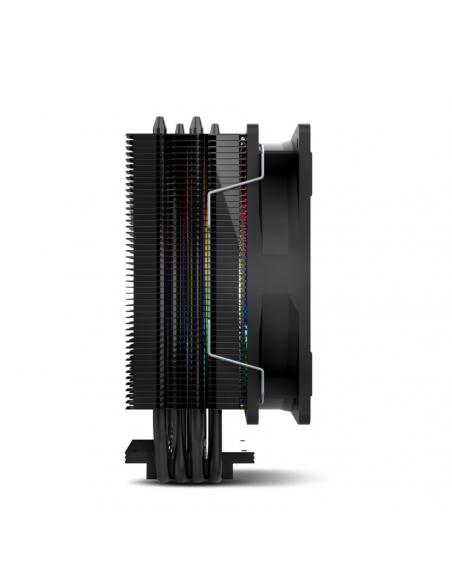 A ventoinha de 120 mm incluída neste cooler possui iluminação ARGB, que permite a personalização da cor e dos efeitos de luz, sincronizando-os com outros componentes compatíveis do sistema. A ventoinha opera numa faixa de velocidade que garante um equilíbrio entre desempenho e nível de ruído, assegurando uma refrigeração eficiente sem comprometer o silêncio.