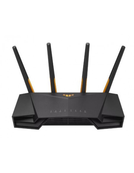 Roteador ASUS TUF-AX4200 AiMesh, um dispositivo de rede de alta performance, com tecnologia Gigabit Ethernet e Wi-Fi 6 (802.11ax) dual-band (2.4GHz/5GHz). Oferece uma velocidade máxima de transferência de dados de 3603 Mbps, garantindo uma conexão rápida e estável para múltiplos dispositivos.  Possui 4 portas Ethernet LAN, uma porta USB 3.2 Gen 1, e suporta diversas funcionalidades avançadas de segurança e controlo de rede.