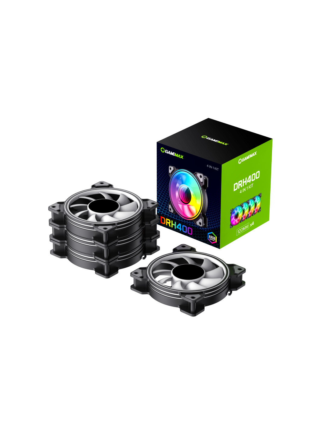 O Kit Gamemax DRH400 é uma solução de refrigeração ideal para entusiastas de gaming, projetado para melhorar o desempenho térmico do seu computador enquanto adiciona um toque estético com a iluminação aRGB. O kit inclui quatro ventoinhas de 120mm com iluminação aRGB de duplo anel e um hub/controlador PWM+aRGB V4.0, oferecendo um controlo preciso da velocidade das ventoinhas e da iluminação. O kit é ideal para quem busca um sistema de refrigeração eficiente, silencioso e visualmente atrativo.