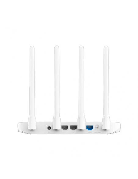 Roteador Wi-Fi Xiaomi Mi Router AC1200, de cor branca, com 4 antenas externas, suporte para Wi-Fi 5 (802.11ac) e velocidades de até 1167 Mbps (banda dupla 2,4GHz e 5GHz). Inclui 64GB de armazenamento.