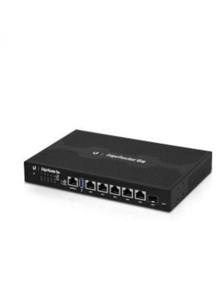 O router Ubiquiti ER-6P é uma solução para pequenas e médias empresas que necessitam de uma rede robusta e de alta performance. Possui uma porta WAN Gigabit Ethernet e quatro portas LAN Gigabit Ethernet. Inclui uma ranhura GBIC para expansão. Sem Wi-Fi, firewall integrado ou suporte VoIP. EAN: 0817882020640. Garantia: 24 meses.