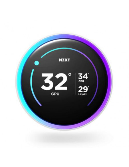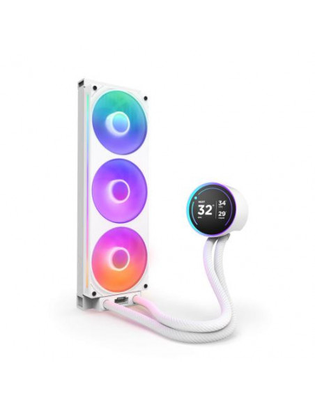 Sistema de refrigeração líquida NZXT Kraken Elite 360 RGB, na cor branca. Inclui três ventoinhas de 12cm, com fluxo de ar máximo de 75.12 cfm e pressão de ar máxima de 3.3 mmH2O. Compatível com diversos sockets de processador AMD e Intel. Apresenta um ecrã LCD incorporado.