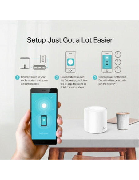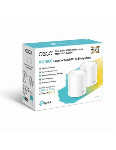 TP-Link Deco X20 (2-pack). Tipo de conexão WAN: RJ-45. Banda wi-fi: Dual-band (2,4 GHz / 5 GHz), Padrão Wi-Fi máximo: Wi-Fi 5 (802.11ac), Velocidade de transferência de dados WLAN (máx.): 1201 Mbit/s. Tipo de interface de ethernet LAN: Gigabit Ethernet, Taxa de transferência de dados Ethernet LAN: 10,100,1000 Mbit/s, Tecnologia de cablagem: 10/100/1000Base-T(X). Geração de rede móvel: 4G. Codificação / segurança: WPA-PSK, WPA2-PSK, WPA3, Seguraça de firewall: SPI