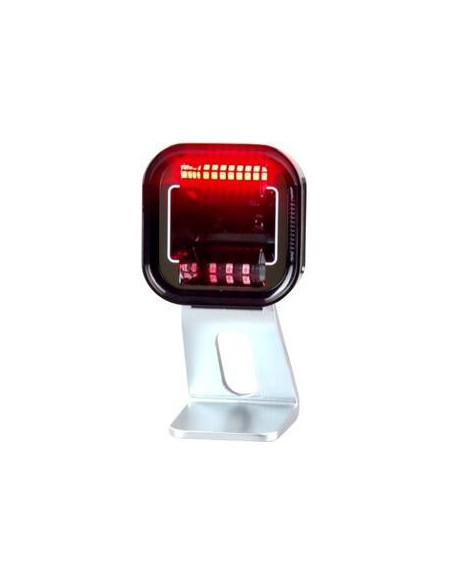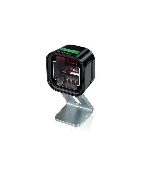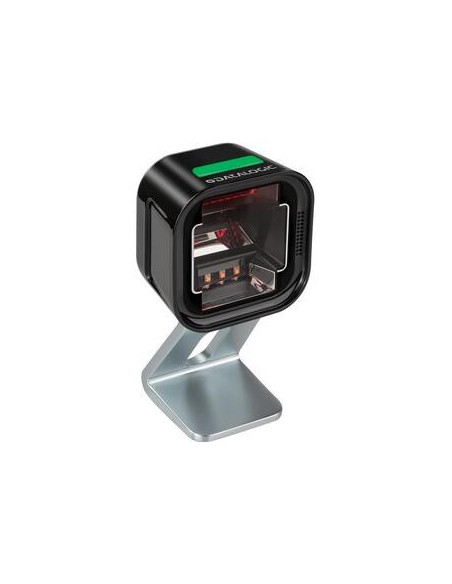 Leitor de códigos de barras DL MGln 1500i, modelo preto, com suporte inclinável. Leitura de códigos de barras 2D. Conexão USB. Design robusto e compacto.