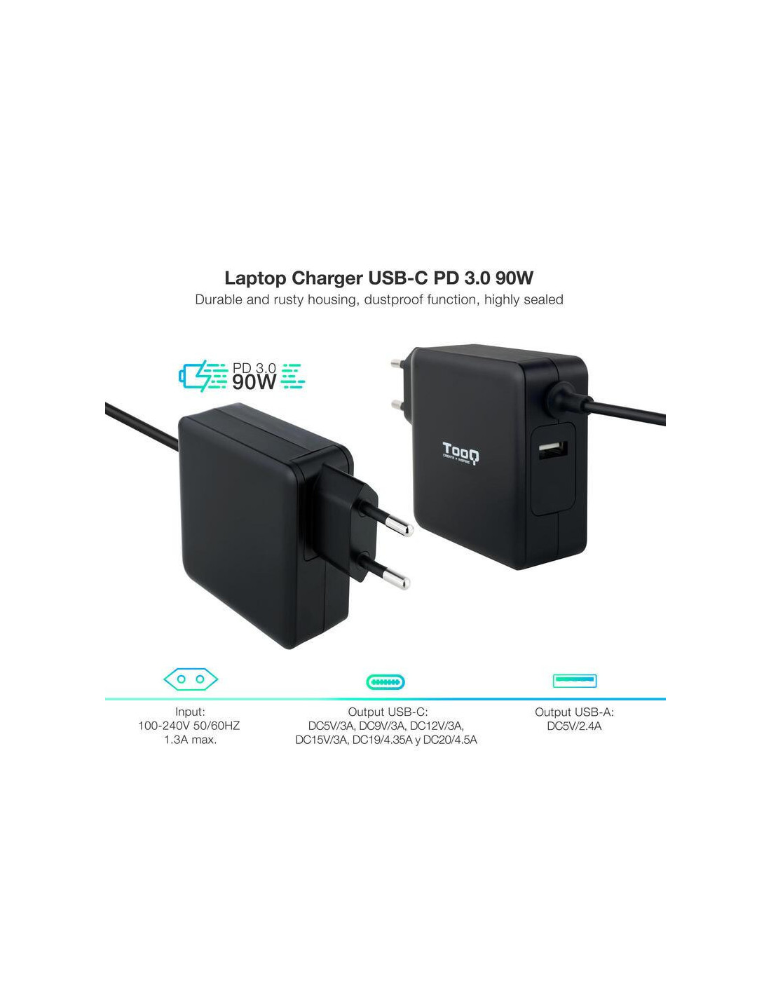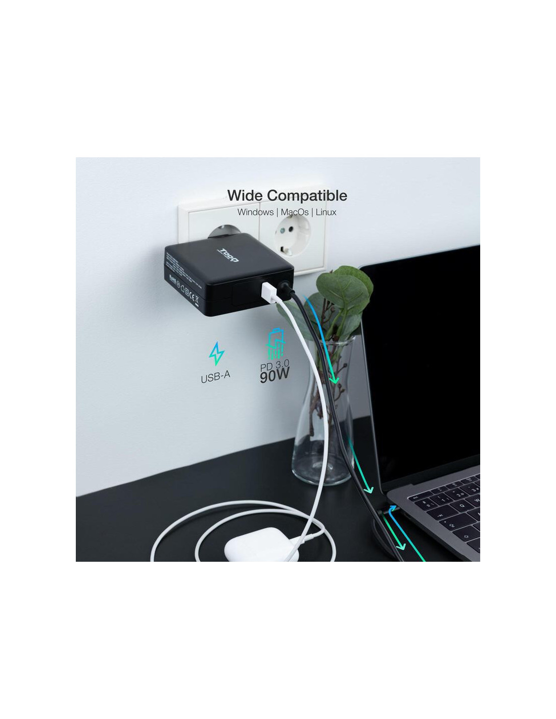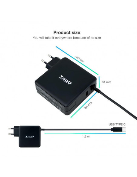 O carregador universal Tooq TQLC-USBC90PD é uma solução potente e versátil para carregar o seu portátil e outros dispositivos com entrada USB-C. Com potência de 90W e compatibilidade com Power Delivery 3.0, garante uma carga rápida e eficiente. Inclui um cabo USB-C de 1.8 metros. Design compacto e elegante em preto.