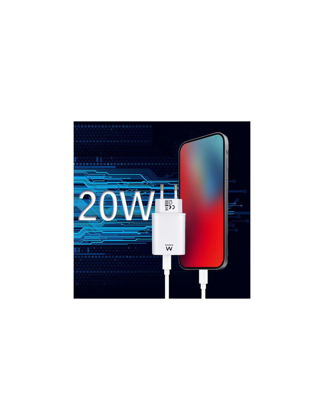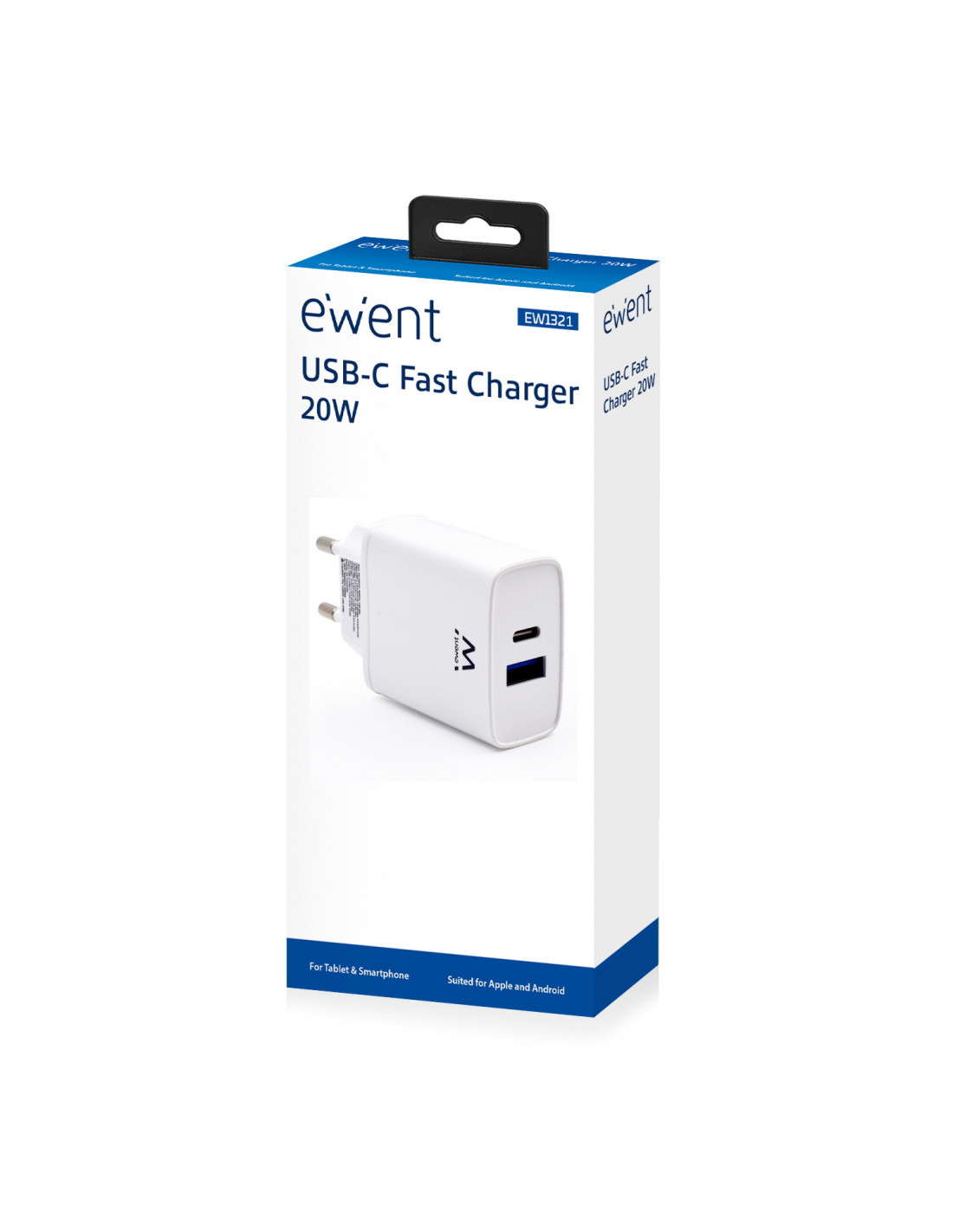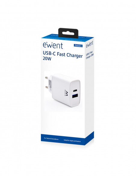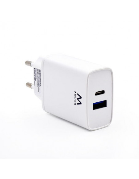 Carregador Ewent EW1321 para dispositivos móveis, com duas portas (USB-C e USB-A), potência de 20W e carregamento rápido. Ideal para smartphones e tablets.
