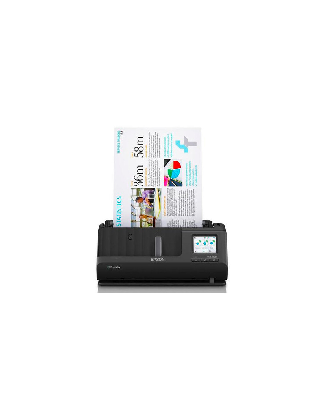 Scanner Epson ES-C380W, formato A4, com ligação em rede. Oferece compatibilidade com vários sistemas operativos e inclui software para gestão e digitalização. Design vertical compacto e eficiente.