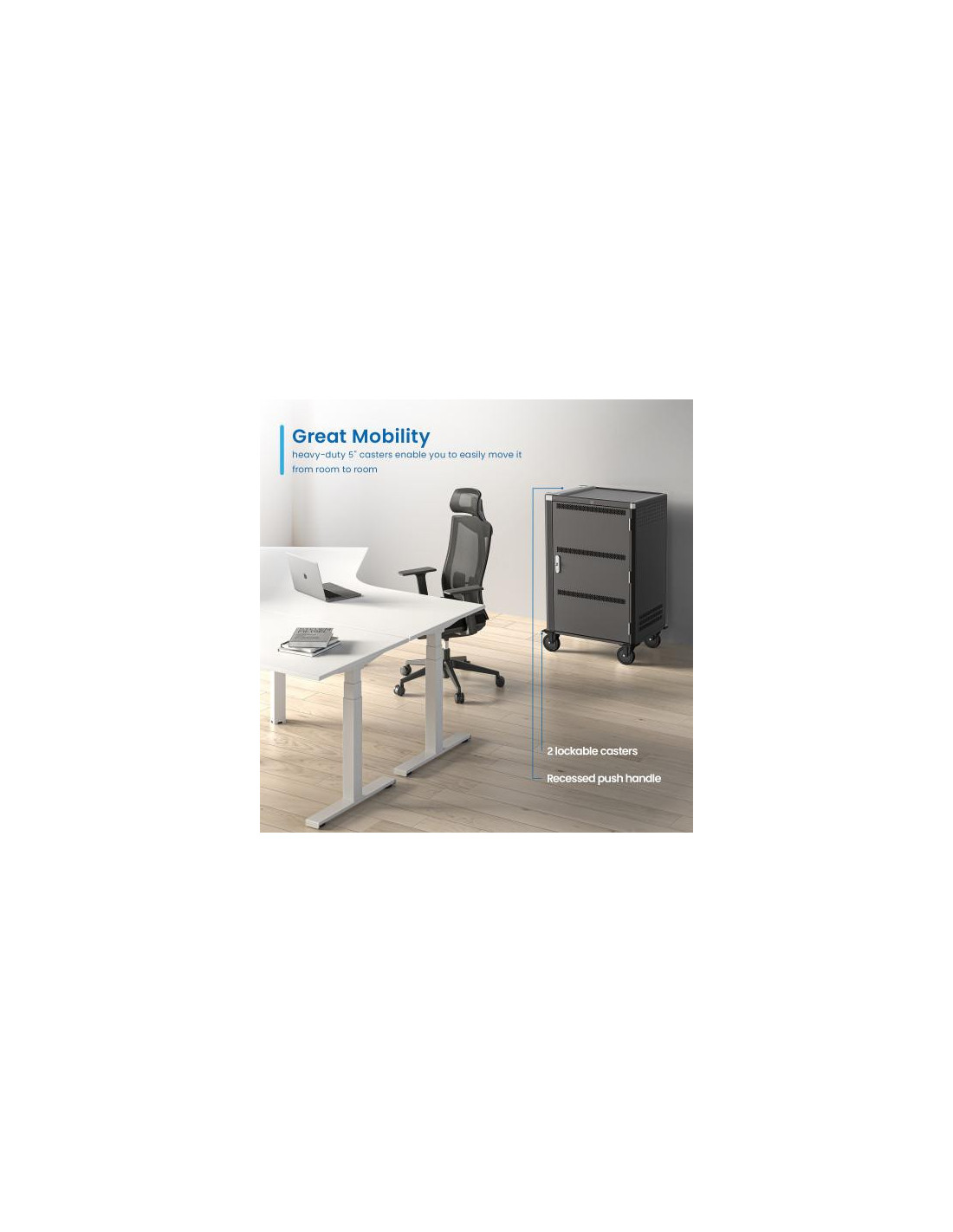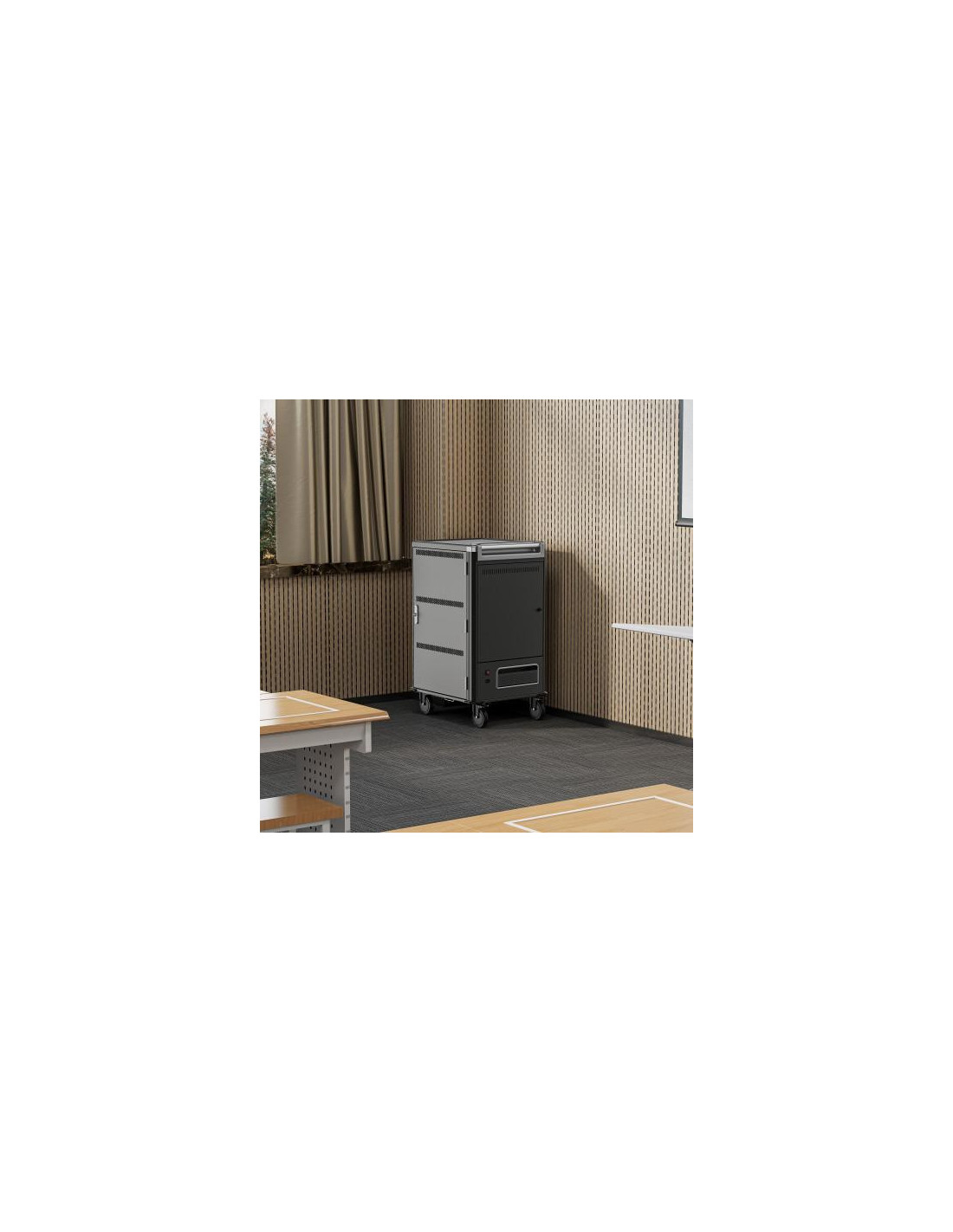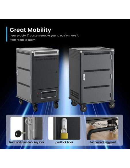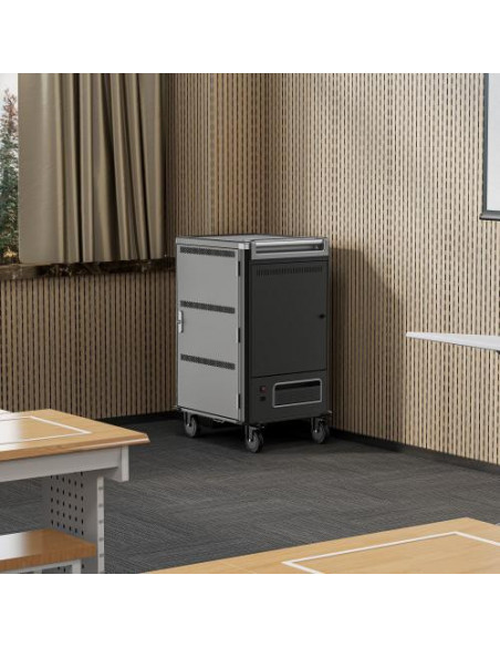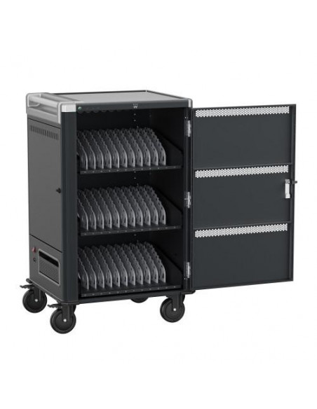 O armário de carga Ewent EW1701 é uma solução ideal para carregar e armazenar até 36 dispositivos portáteis, como tablets, Chromebooks ou laptops com ecrãs até 15,6 polegadas. Oferece um sistema de carga inteligente, gestão de cabos e segurança com porta de bloqueio. É fornecido totalmente montado, facilitando a sua instalação.