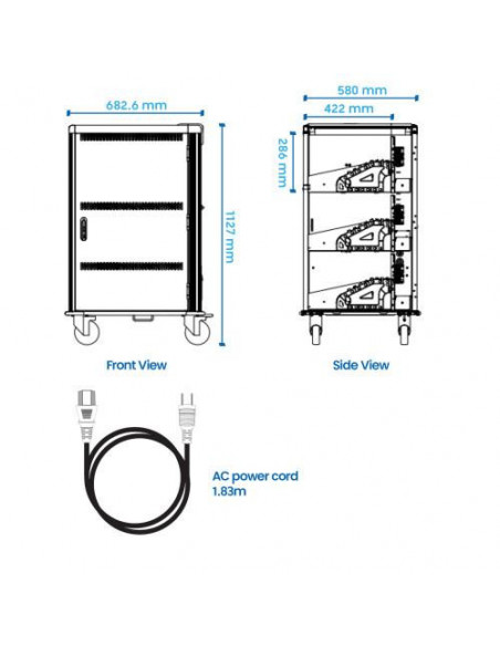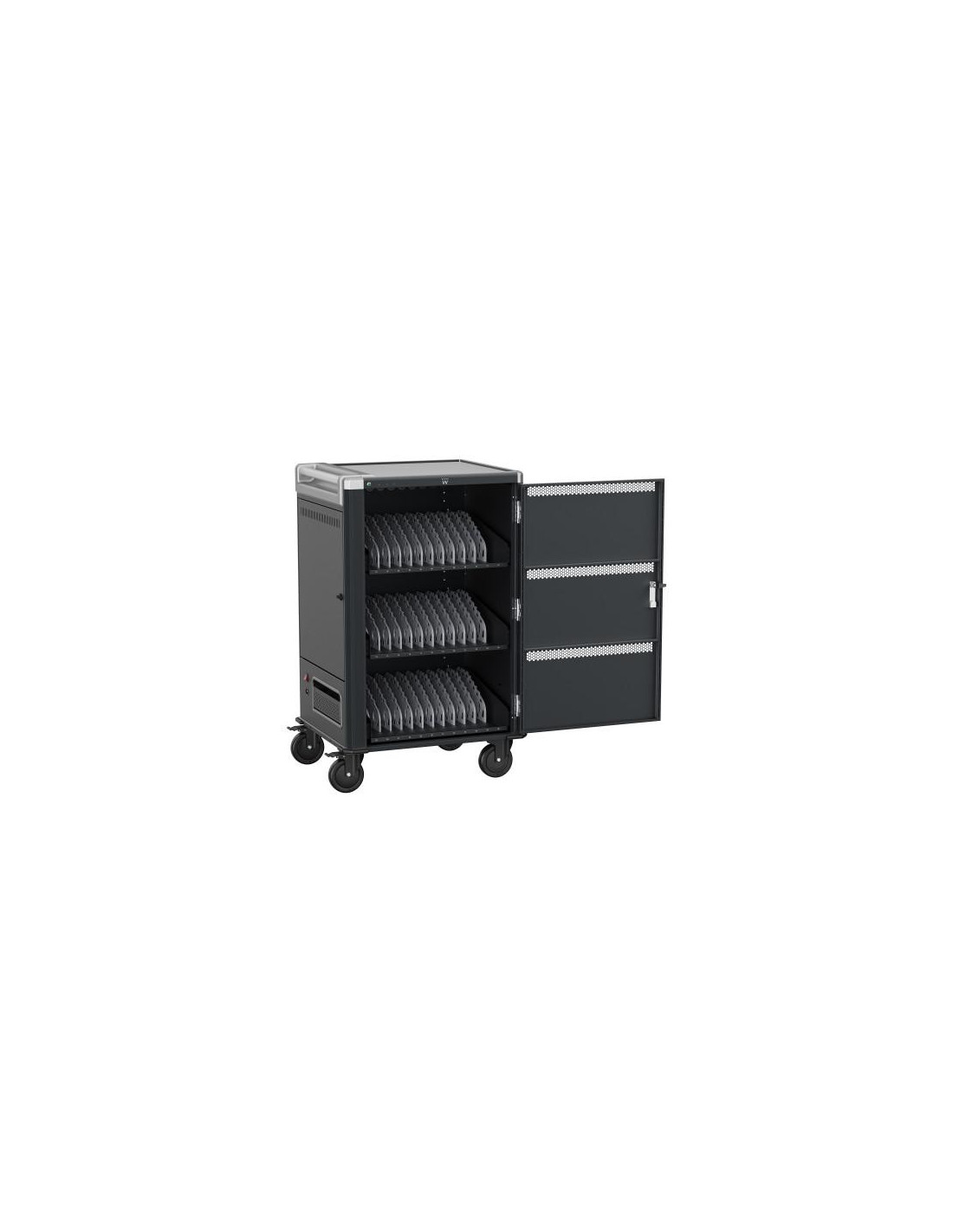 O armário de carga Ewent EW1701 permite-lhe organizar, carregar e proteger simultaneamente até 36 tablets, Chromebooks ou laptops com ecrãs até 15,6 polegadas (39,6 cm). Este armário inteligente proporciona uma solução eficiente para escolas, bibliotecas ou empresas com vários dispositivos portáteis. Cada dispositivo tem um espaço numerado e um espaço dedicado à alimentação, otimizando a organização e a gestão dos cabos. O armário possui portas ventiladas para evitar o sobreaquecimento dos equipamentos e um sistema de fecho com chave de 3 pontos para garantir a segurança. A possibilidade de adicionar um cadeado externo reforça ainda mais a segurança dos seus equipamentos. O armário é construído em aço, e inclui alças e rodas com travão para facilitar o transporte e manuseamento. A sua instalação é simples, uma vez que é fornecido totalmente montado. As suas dimensões são: 682,6 mm (largura), 580 mm (profundidade) e 1127 mm (altura). O peso é de 92 kg. As dimensões da embalagem são: 733 mm (largura), 630 mm (profundidade) e 1272 mm (altura), com um peso de 118 kg. É incluído um cabo de alimentação AC de 1,83 metros de comprimento e as chaves do armário.
