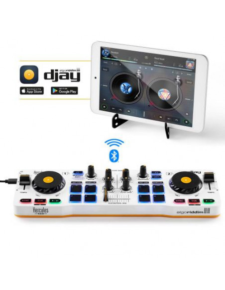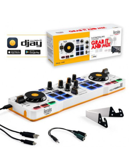 A consola DJ Hercules DJControl Mix é uma solução compacta e fácil de usar, ideal para DJs principiantes ou para utilização em festas e eventos mais pequenos. Integra conectividade Bluetooth para ligação a smartphones e tablets, e uma interface USB para ligação a computadores. Inclui software DJ para iOS e Android.