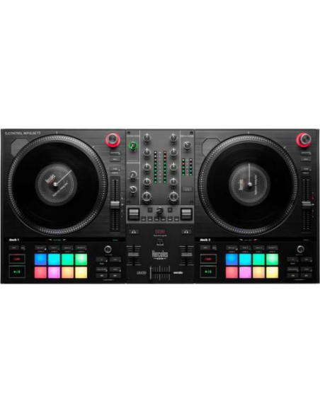 A Hercules DJ Control INPULSE T7 é uma controladora DJ projetada para facilitar a transição para o mundo do DJing. O seu design intuitivo e os seus comandos ergonômicos tornam a sua utilização simples e confortável. O destaque reside nos dois gira-discos motorizados de 7 polegadas, que simulam a sensação de tocar em vinil, proporcionando uma experiência mais tátil e familiar para quem está acostumado ao formato tradicional. A INPULSE T7 oferece um conjunto completo de recursos, incluindo Beat Match Guide para auxiliar na sincronização de batidas, seleção de efeitos com interruptor Rocker e controle de efeitos dedicado. Possui duas saídas master XLR, duas saídas RCA, saídas de auscultadores de 3,5 mm e 6,3 mm, e uma entrada de microfone (jack de 6,3 mm balanceado). A interface de áudio integrada é de alta qualidade (44,1 kHz / 24-bit). O software Serato DJ Lite está incluído, permitindo iniciar imediatamente a mixagem de músicas. Existe a opção de upgrade para o Serato DJ Pro. Também inclui o software DJUCED. A controladora possui dimensões de 652 x 350 x 90 mm e pesa 5 kg. O cabo incluído é um cabo USB-A para USB-B trançado. Cada deck oferece controle de ganho, fader de tom de 100 mm, fader de volume, controle de filtro, equalizador de 3 bandas, medidor VU, Play/Pause, Cue, Shift, Sync e 8 pads RGB com 8 modos. Os controles gerais incluem potenciómetro de volume principal, crossfader, potenciómetro de volume de auscultadores e potenciómetro 'Cue/Mix'.