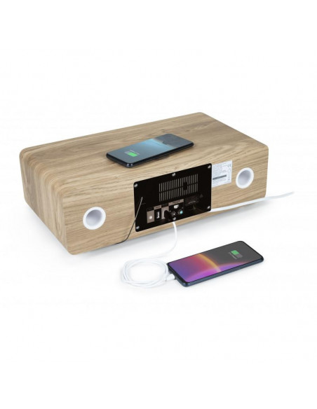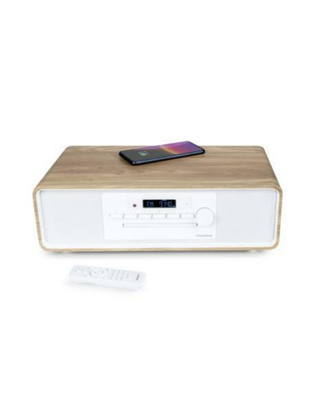 Muito elegante com as suas curvas arredondadas e o seu revestimento em "carvalho" claro", este sistema estéreo permite que você ouça sua música em Bluetooth, em chave USB, usando um MP3 player conectado ao AUX-IN, em CD ou no rádio. Conecte também gira-discos vinil  ao RCA para aproveitar esta experiência auditiva especial que os vinis oferecem. recarregue o seu smartphone por indução ou USB. Equipado com um potência musical de 60W, este conjunto oferece inúmeras possibilidades de escuta.Características, Bluetooth® 5.0,Sistema estéreo, Equalizador,Radio FM,50 estações memorizadas, Exibição de tempo,Leitor de CD,AUX-IN 3,5 mm (cabo incluído),Leitor USB (MP3),Saída RCA,Carregador USB (5V-1A),Carregador de indução sem fio (10 W),Controle remot(...)