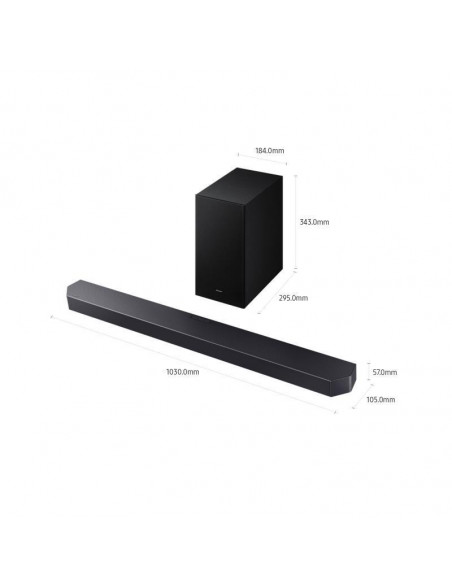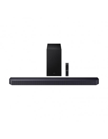 Samsung Q-series HW-Q600F. Canais de saída de áudio: 3.1.2 canais, Descodificadores de som: DTS Virtual:X, Dolby Atmos, Dolby Digital 5.1, Dolby Digital Plus, Dolby TrueHD, Modos de equalizador: Adaptativo, Game Pro, Padrão, Expansão do som surround. Conectividade do subwoofer: Sem fios. Cor do produto: Preto, Nome da cor: Titan Black, Tecnologia High Dynamic Range (HDR): High Dynamic Range 10+ (HDR10 Plus). Tecnologia de conetividade: Com fios e sem fios. Consumo de energia da soundbar: 34 W, Consumo de energia do subwoofer: 40 W, Consumo de energia (standby): 0,5 W ;