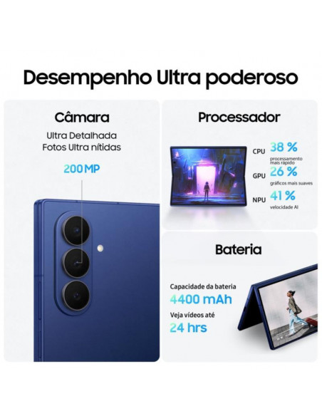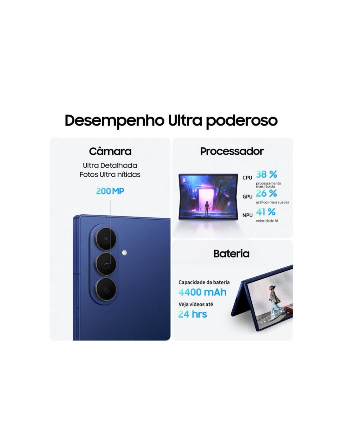 Samsung SM-F966BDBBEUB. Tamanho do ecrã na diagonal: 20,3 cm (8"), Resolução: 2184 x 1968 pixels. Família de processador: Qualcomm Snapdragon, Modelo de processador: 8 Gen 3. Capacidade RAM: 12 GB, Capacidade de armazenamento interno: 256 GB. Resolução da câmara traseira (numérico): 200 MP, Tipo de câmara traseira: Câmara tripla. Sistema operativo instalado: Android 16.0. Capacidade da bateria: 4400 mAh. Cor do produto: Azul. Peso: 215 g ;