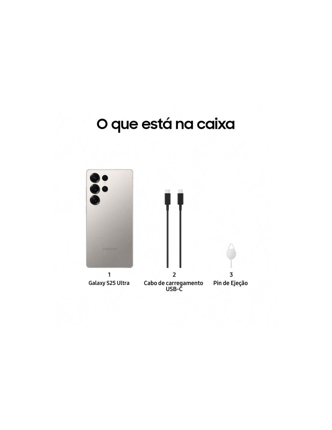 Samsung Galaxy S25 Ultra . Tamanho do ecrã na diagonal: 17,5 cm (6.9"), Resolução: 3120 x 1440 pixels. Família de processador: Qualcomm Snapdragon, Modelo de processador: 8 Elite. Capacidade RAM: 12 GB, Capacidade de armazenamento interno: 512 GB. Resolução da câmara traseira (numérico): 200 MP, Tipo de câmara traseira: Quatro câmeras. Capacidade cartão SIM: Dual SIM. Sistema operativo instalado: Android 15. Capacidade da bateria: 5000 mAh. Cor do produto: Cinzento, Titânio. Peso: 218 g ;