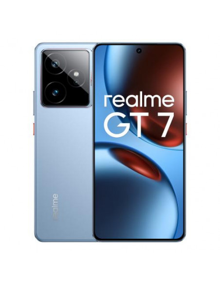 Smartphone realme GT 7 com ecrã AMOLED de 6,78 polegadas, resolução não especificada, taxa de atualização de 120 Hz e brilho máximo de 1800 cd/m². Possui 12 GB de RAM, 256 GB de armazenamento interno, e uma bateria de 7000 mAh. A câmara traseira tripla possui um sensor principal de 50 MP, com estabilização de imagem óptica (OIS). Inclui conectividade 5G, NFC e tecnologia Dolby Vision. Disponível na cor azul.