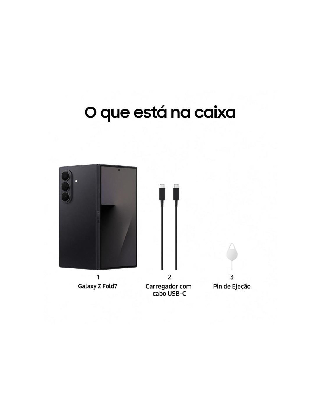 Smartphone dobrável Samsung Galaxy Z Fold7 com ecrã principal de 7.6 polegadas e ecrã de capa de 6.2 polegadas. Possui 12GB de RAM, 256GB de armazenamento interno, processador potente e câmara principal de 200MP. Disponível em preto.