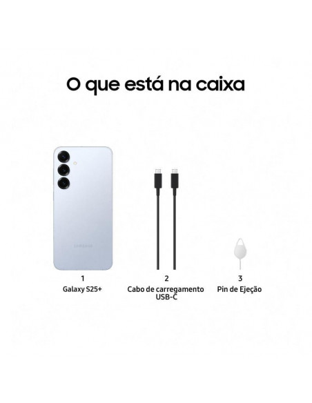 Samsung Galaxy S25+ . Tamanho do ecrã na diagonal: 17 cm (6.7"), Resolução: 3120 x 1440 pixels. Família de processador: Qualcomm Snapdragon, Modelo de processador: 8 Elite. Capacidade RAM: 12 GB, Capacidade de armazenamento interno: 256 GB. Resolução da câmara traseira (numérico): 50 MP, Tipo de câmara traseira: Câmara tripla. Capacidade cartão SIM: Dual SIM. Sistema operativo instalado: Android 15. Capacidade da bateria: 4900 mAh. Cor do produto: Azul. Peso: 190 g ;