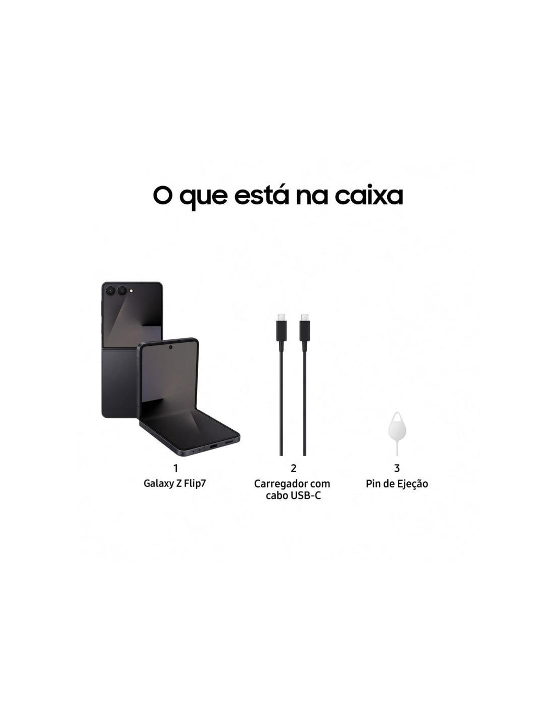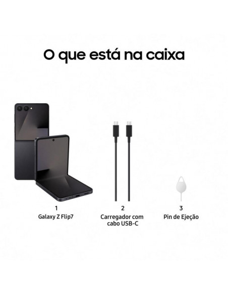 Smartphone Samsung Galaxy Z Flip7 com ecrã interior de 8” Dynamic AMOLED 2X (2184x1968, 1-120 Hz) e ecrã exterior de 6,5” Dynamic AMOLED 2X (2520x1080, 1-120 Hz). Integra 12GB de RAM LPDDR5 e 256GB de armazenamento interno. Processador Snapdragon 8 Elite for Galaxy (3nm). Câmara principal com 200MP OIS DualPixel, ultra grande angular de 12MP e teleobjetiva de 10MP com 3x zoom ótico. Inclui ainda câmaras frontais interna e externa de 10MP. Sistema operativo Android 16 com One UI 8.