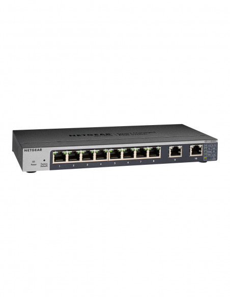 NETGEAR GS110EMX. Tipo de switch: Gerido, Camada de switches: L2. Tipos de portas ethernet Basic switching RJ-45: 10G Ethernet (100/1000/10000), Número de portas ethernet Basic switching RJ-45: 10, Entrada de consola: RJ-45. Tabela de endereços MAC: 16000 entradas, Capacidade de routing/switching: 56 Gbit/s. Normas de Comunicações: IEEE 802.1Q, IEEE 802.1p. Voltagem de entrada DC: 15.6 V. Conetor de alimentação: Tomada de entrada DC. Montagem em prateleira
