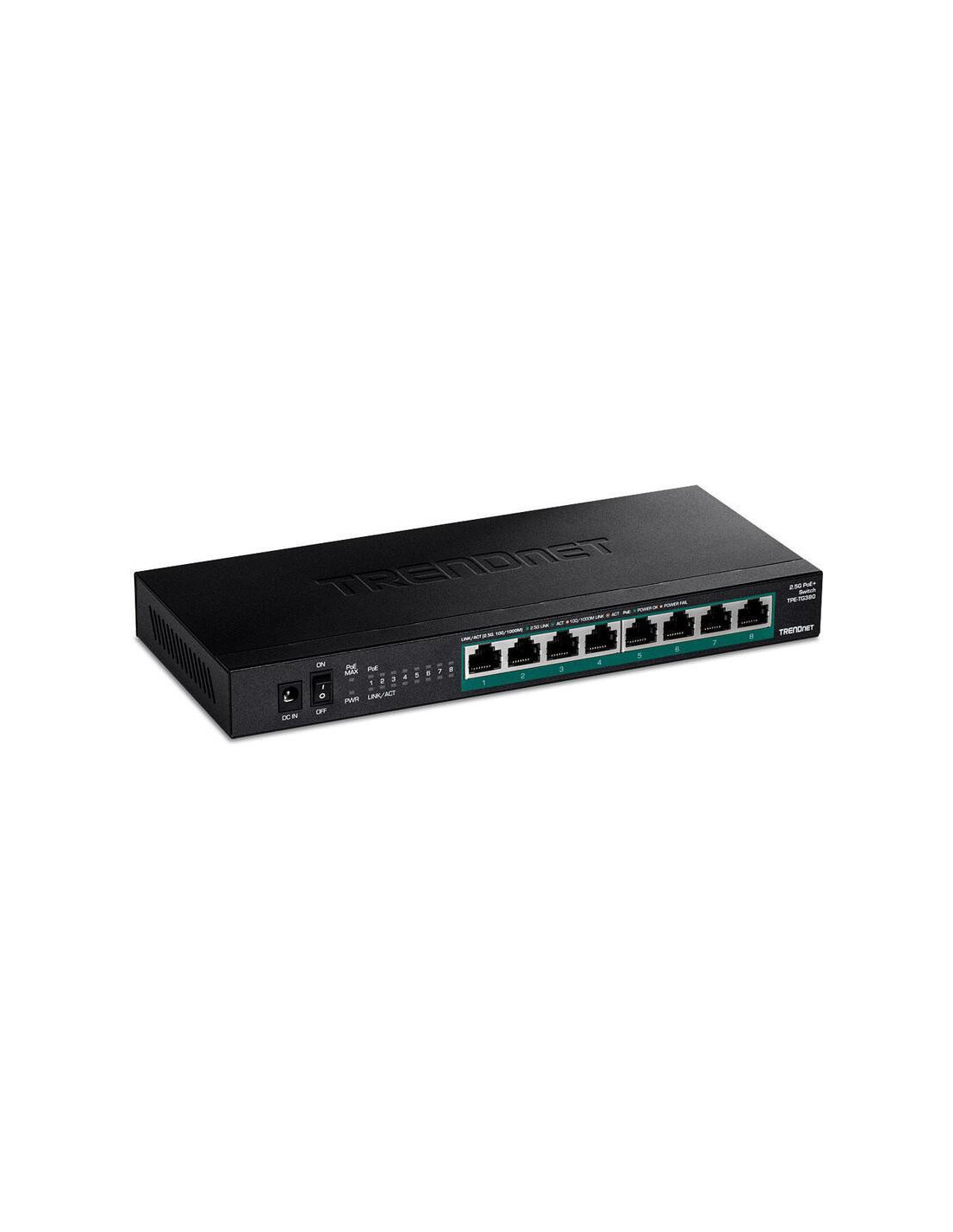 Switch de rede não-gerenciado Trendnet TPE-TG380 com 8 portas 2.5G PoE+, ideal para pequenas e médias empresas. Oferece conectividade rápida e eficiente para dispositivos com e sem PoE.