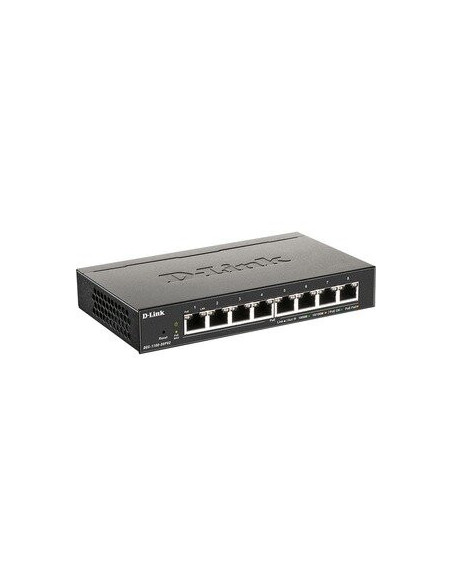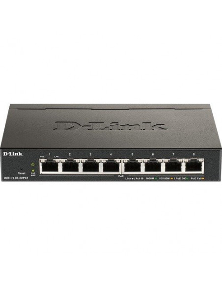 Switch Gigabit Ethernet D-Link DGS-1100-08PV2 com 8 portas PoE, gestão inteligente Layer 2. Oferece 64W de orçamento PoE e é compatível com 1000Base-T. Design de mesa. Respeitoso do ambiente.
