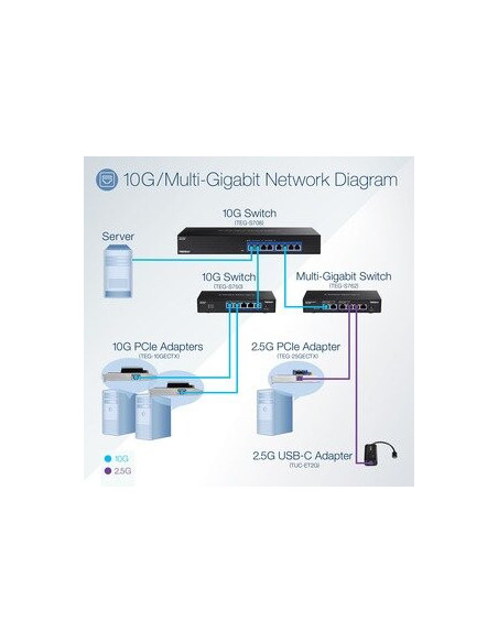 O switch Ethernet Trendnet TEG-S708 é uma solução de rede de alta performance, projetada para atender às necessidades de redes modernas. Com 8 portas 10 Gigabit Ethernet (10GBase-T), este switch oferece velocidades de transferência de dados excepcionalmente rápidas, ideais para aplicações que exigem alta largura de banda, como streaming de vídeo de alta definição, jogos online e transferência de ficheiros grandes. Além das portas 10G, o TEG-S708 também suporta 5 Gigabit Ethernet (5GBase-T) e 2.5 Gigabit Ethernet (2.5GBase-T), oferecendo flexibilidade e compatibilidade com uma ampla variedade de dispositivos. Com uma capacidade de comutação de 160 Gbps, o switch garante um desempenho suave e sem atrasos, mesmo sob carga pesada. O TEG-S708 é um switch de camada 2, simples de configurar e gerir, tornando-o uma opção ideal para pequenas e médias empresas. O seu design compacto e montagem em rack 1U permite uma integração eficiente em qualquer ambiente de rede. O consumo de energia é de 9,50 W e opera com tensão de entrada de 120V AC ou 230V AC a 50/60 Hz. As dimensões são 160mm (comprimento), 109mm (altura) e 25mm (largura), com um peso aproximado de 414g. As dimensões da embalagem são 0,38m (comprimento), 0,32m (largura) e 0,07m (altura), com um peso de envio de 3,35kg. O switch suporta diferentes padrões IEEE, incluindo 802.3, 802.3u, 802.3x, 802.3z, 802.3an, 802.3bz e 802.3ab.