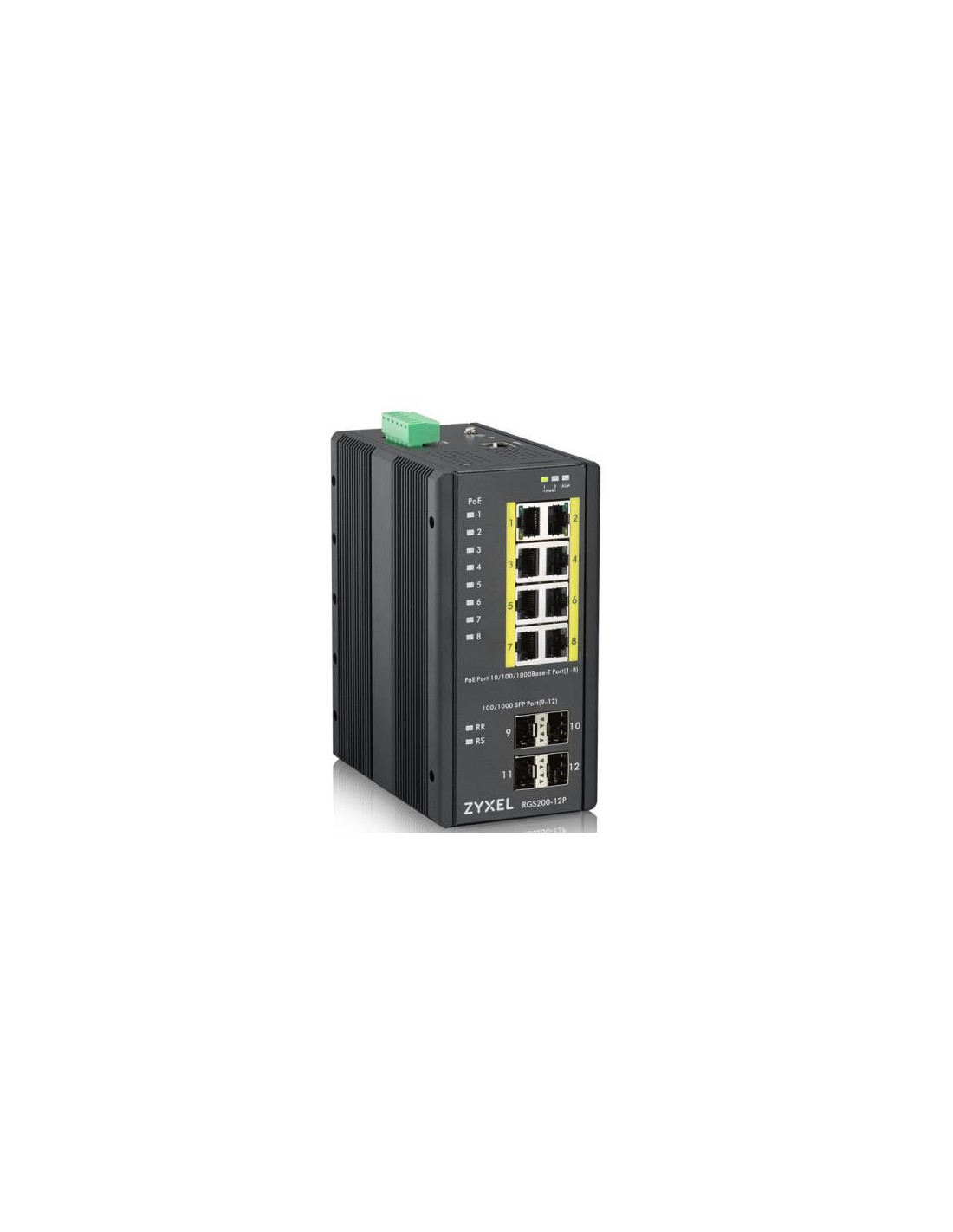 Zyxel RGS200-12P. Tipo de interruptor: Gestionado, Capa del interruptor: L2. Puertos tipo básico de conmutación RJ-45 Ethernet: Gigabit Ethernet (10/100/1000), Cantidad de puertos básicos de conmutación RJ-45 Ethernet: 8. Bidireccional completo (Full duplex). Tabla de direcciones MAC: 8000 entradas, Capacidad de conmutación: 24 Gbit/s. Estándares de red: IEEE 802.1D,IEEE 802.1Q,IEEE 802.1ab,IEEE 802.1p,IEEE 802.1s,IEEE 802.1w,IEEE 802.3,IEEE.... Voltaje de entrada DC: 12 - 58 V. Energía sobre Ethernet (PoE). Montaje de pared, Montaje en rack
