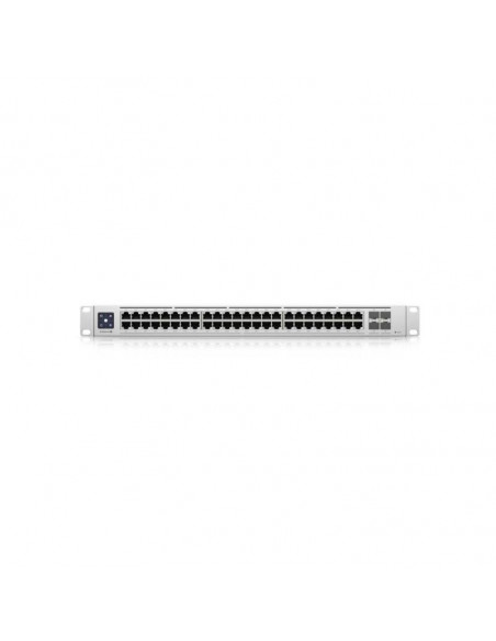 **Uplinks SFP+ para conectividade expandida:** Com quatro uplinks SFP+, o USW-ENTERPRISE-48-POE permite a expansão e integração com outros switches e equipamentos de rede, utilizando cabos de fibra óptica para maior alcance e velocidade. Esta capacidade de expansão é essencial para redes de médio e grande porte, que necessitam de alta largura de banda e conectividade.