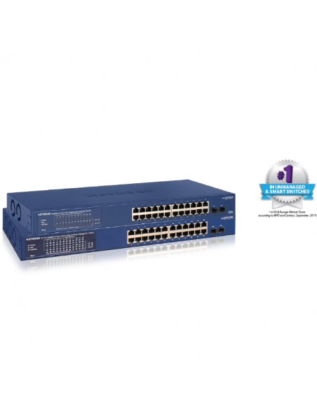 Além das 24 portas Gigabit Ethernet PoE+, o GS724TPP-100EUS inclui 2 portas SFP (Small Form-factor Pluggable) 1GbE, permitindo conectividade de alta velocidade para uplinks adicionais ou expansão da rede. Estas portas oferecem flexibilidade na arquitetura da rede, permitindo a conexão a fibras ópticas para distâncias maiores ou a outros switches para aumentar a capacidade da rede.