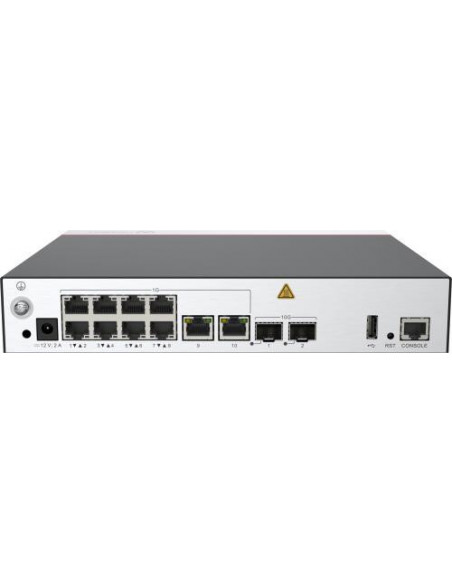 O Huawei AC650-256AP é um switch de rede com 10 portas Ethernet LAN de 10/100/1000 Mbps e 2 portas SFP+ de 10 Gigabit. Oferece capacidade de gateway e controlo, sendo ideal para redes de pequena a média dimensão. Integra uma memória flash de 1000 MB e possui dimensões compactas, num design em tom cinzento.