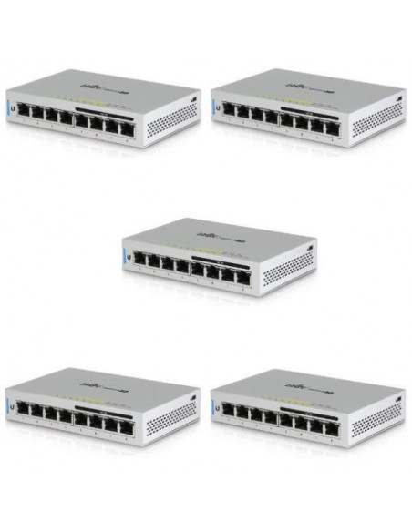 Pack de 5 switches Ubiquiti UniFi US-8-60W, com 8 portas Gigabit Ethernet e 4 portas PoE.  Ideal para redes pequenas e médias que necessitem de alimentar dispositivos via PoE.  Fácil gestão através da plataforma UniFi.