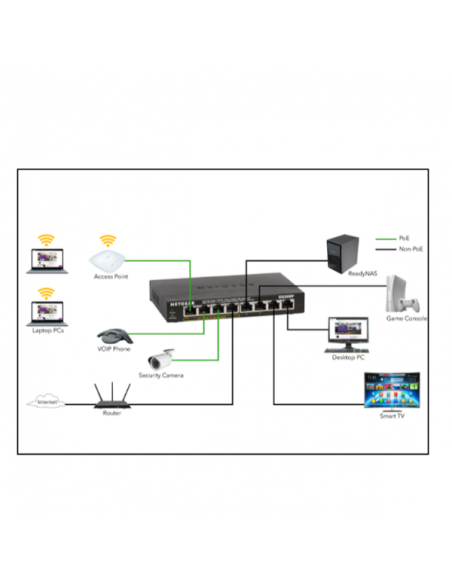 Switch Netgear GS308PP-100EU não gerido de 8 portas Gigabit Ethernet com PoE. Ideal para pequenas redes e escritórios domésticos, oferecendo conectividade rápida e confiável. 8 portas PoE para alimentar dispositivos compatíveis com PoE.