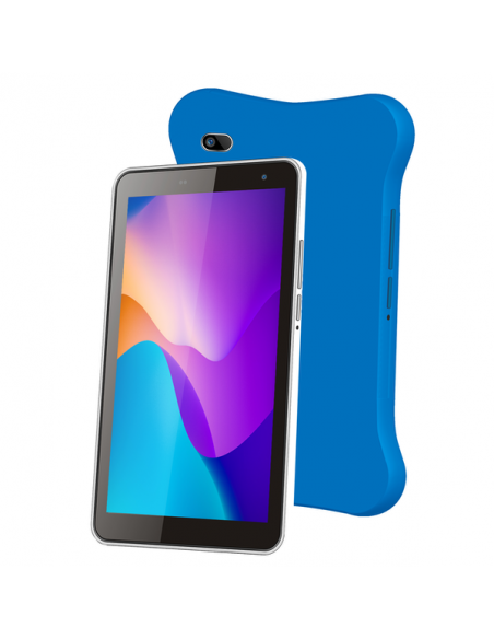 O tablet possui conectividade Wi-Fi 802.11 b/g/n e Bluetooth 4.0, permitindo a ligação a redes sem fios e a outros dispositivos compatíveis. Inclui também uma câmara frontal e traseira de 2MP para videochamadas e fotos básicas. A porta USB Type-C (USB 2.0) facilita a ligação de periféricos e o carregamento do dispositivo. O tablet vem acompanhado por uma capa protetora azul, que ajuda a proteger o dispositivo contra quedas e riscos.