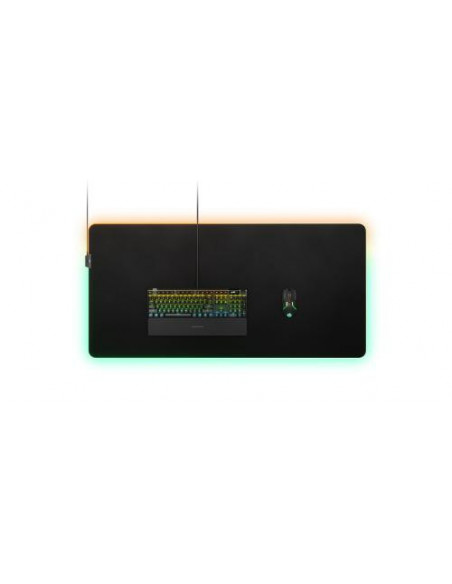 Tapete de rato Steelseries QcK Prism Cloth 3XL, com iluminação RGB personalizável e superfície em tecido para um controlo preciso do cursor. Grande formato (1220 x 590 mm) para maior conforto e espaço para movimentos amplos. Base antiderrapante para uma fixação estável na sua secretária.