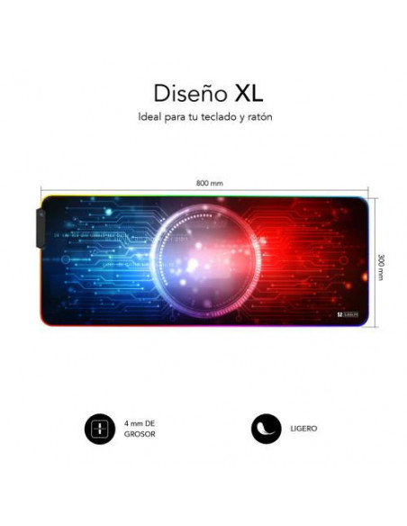 Este tapete de rato Subblim extra grande com iluminação LED RGB oferece uma experiência superior para trabalho ou lazer. Com 9 cores e 3 modos de iluminação, personaliza o seu espaço de trabalho. A superfície ultra suave garante um movimento preciso do rato, enquanto a base de borracha antideslizante assegura estabilidade. O seu design inclui um chipset avançado e um cabo USB removível. É também à prova de água e fácil de limpar.