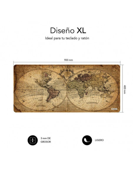 Tapete de rato SUBBLIM Vintage World XL, com dimensões generosas de 90x40cm. Base antiderrapante para uma utilização estável. Superfície resistente à água para fácil limpeza. Design elegante com mapa mundial vintage.