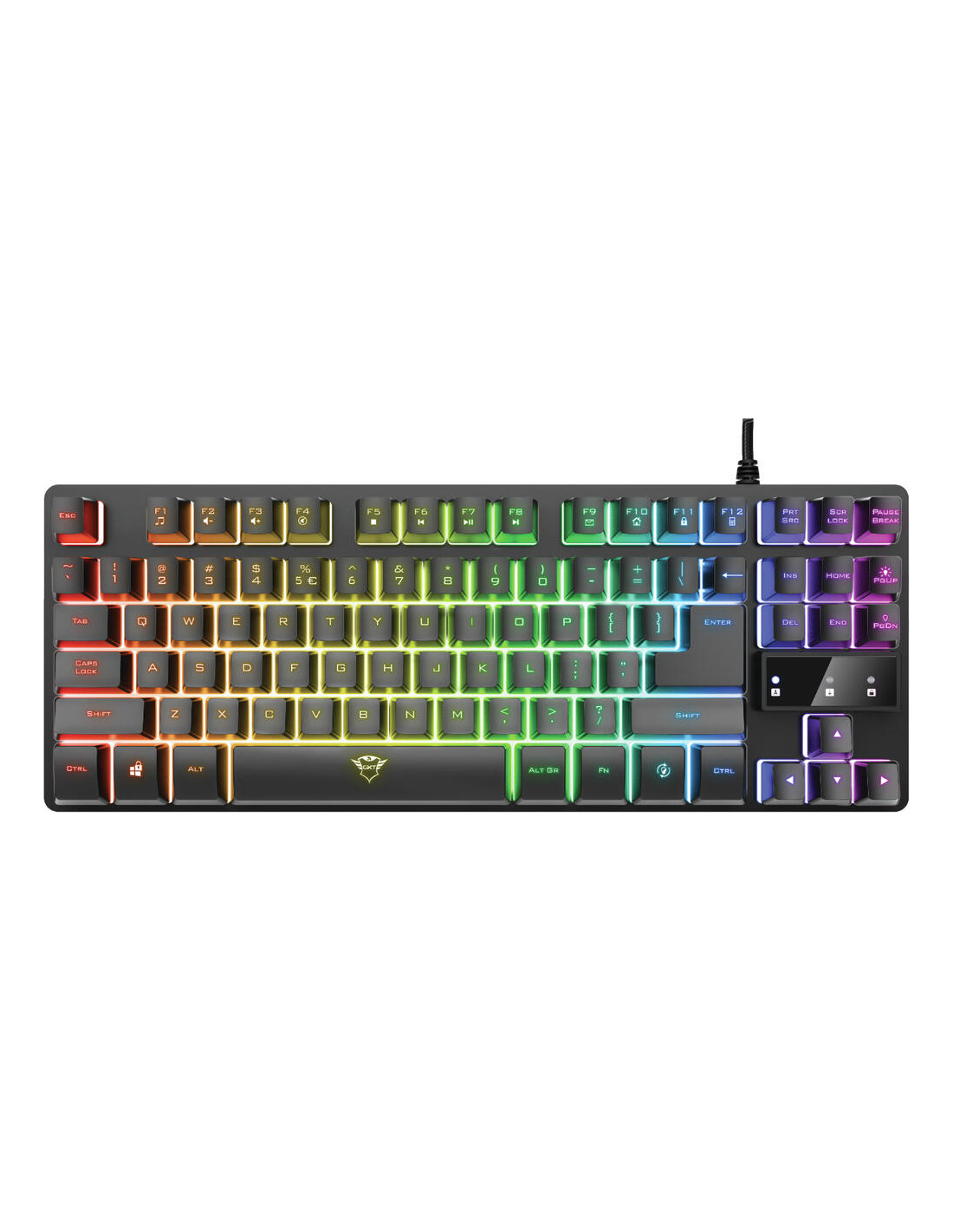 Teclado gaming compacto da TRUST, modelo GXT 833 Thado, com estrutura em metal e iluminação RGB multicolor. Ideal para jogadores que procuram um teclado resistente e com um design elegante. Oferece uma experiência de jogo imersiva e personalizada.