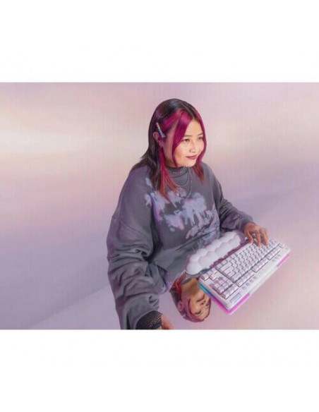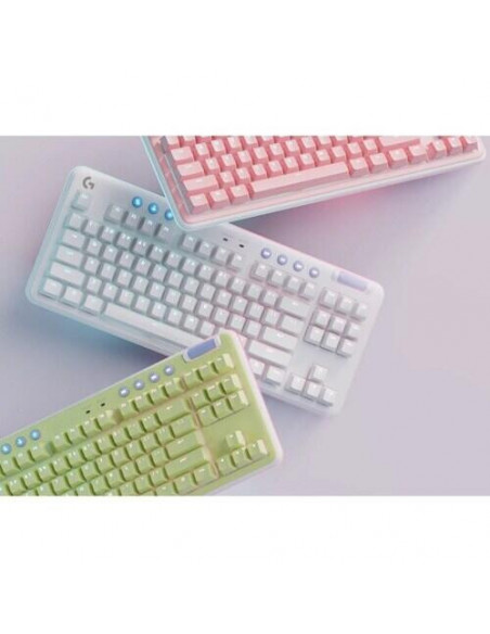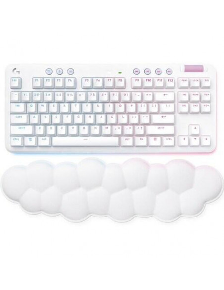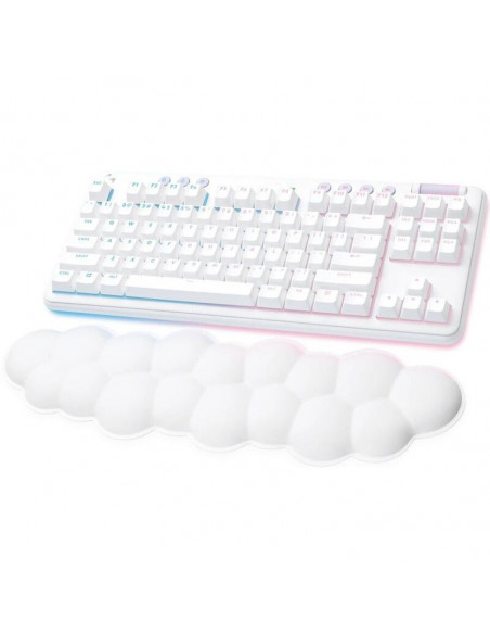 O teclado para jogos Logitech G715 Wireless da coleção Aurora é um teclado mecânico sem teclado numérico, compacto e confortável. Oferece iluminação RGB, conectividade sem fios LIGHTSPEED e Bluetooth, e interruptores mecânicos GX (modelo específico a verificar). Inclui um mullido reposamanos. Disponível em branco. Ideal para jogos em PC e Mac.
