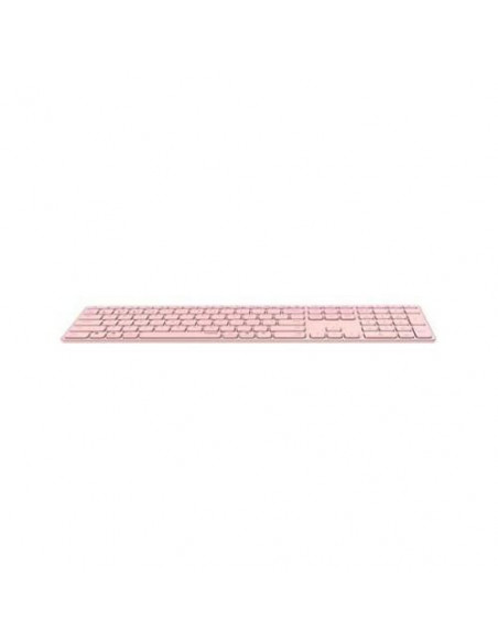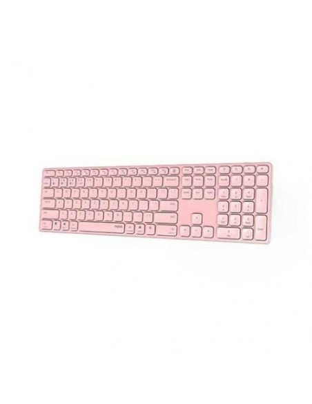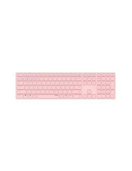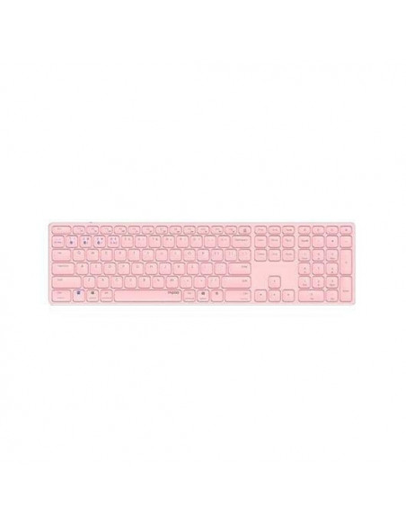Teclado sem fios RAPOO E9800M na cor rosa. Este teclado QWERTY inclui teclado numérico e liga-se via Bluetooth 5.0 ou 2.4GHz. Utiliza uma bateria de lítio recarregável.