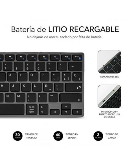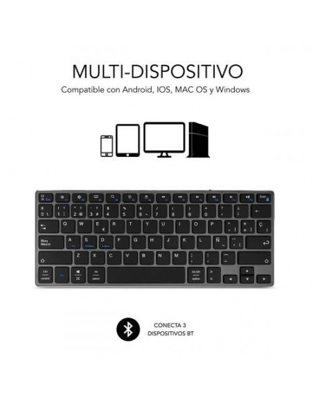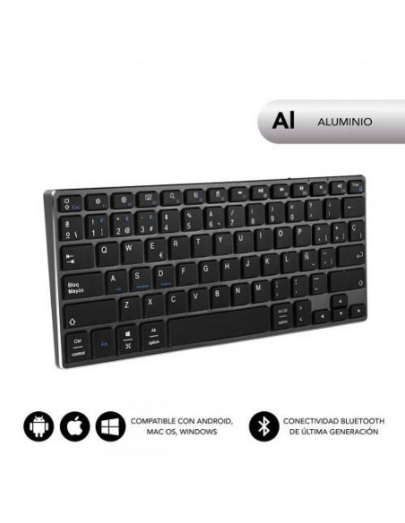 Teclado sem fios Bluetooth Subblim Advance Compact, com design elegante em alumínio escovado e teclas de mecanismo de tesoura. Compatível com Mac, Windows, tablets iOS e Android. Oferece ligação estável e a possibilidade de conectar até três dispositivos simultaneamente. Inclui bateria recarregável de iões de lítio com duração de até dois meses.