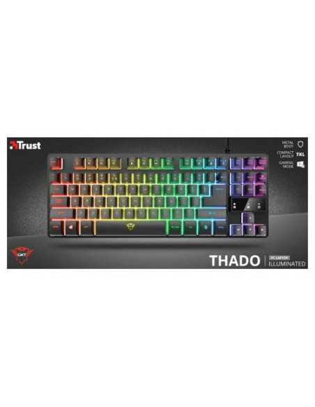 O teclado gaming Trust GXT 833 Thado é um modelo TKL (Tenkeyless) com design compacto, cerca de 20% menor que os teclados de tamanho normal, ideal para transporte e poupança de espaço na secretária. Possui iluminação LED com efeito respiratório, placa metálica para robustez e várias funcionalidades para gaming, como anti-ghosting (até 10 teclas simultâneas) e desativação da tecla Windows. Inclui 12 teclas de atalho multimedia.