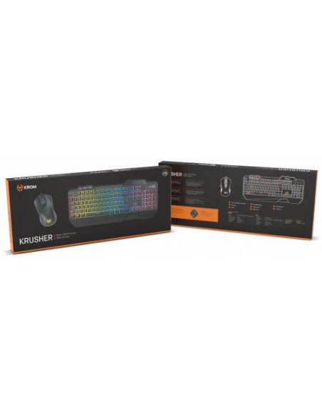 Pack gaming Nox Krom Krusher composto por um teclado semi-mecânico e um rato, ambos com iluminação RGB e design preto. O teclado possui switches semi-mecânicos, teclas multimédia e descanso de pulso. O rato tem sensor óptico de 6400 DPI e 7 botões. Ideal para jogadores que procuram um conjunto de periféricos acessíveis com boa performance e estética.