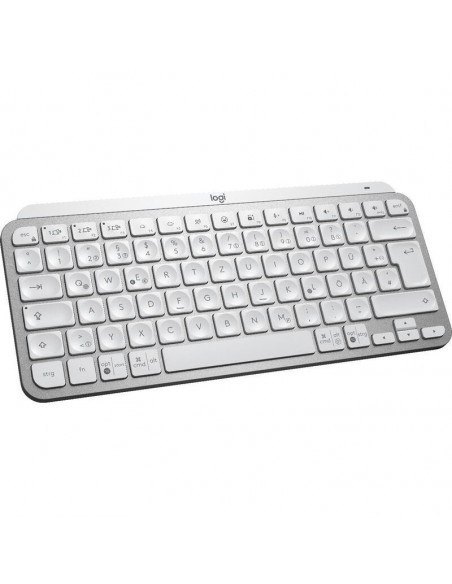 O teclado Logitech MX Keys Mini é um teclado sem fios minimalista e iluminado, ideal para escritórios. Oferece conectividade RF Wireless e Bluetooth, layout QWERTZ alemão e um design elegante em cinza.