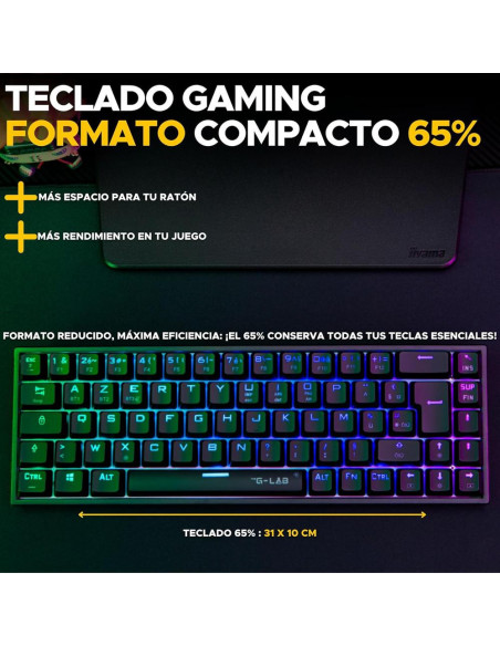 Teclado mecânico para jogos The G-lab Keyz Titanium, modelo KEYZ-TITAN-B/SP, com layout espanhol QWERTY 65%. Este teclado destaca-se pelo seu switch vermelho, iluminação RGB personalizável, função anti-ghosting e macros programáveis. Compatível com PC, PS4, PS5 e Xbox. A sua construção robusta e design elegante tornam-no perfeito para jogadores exigentes.