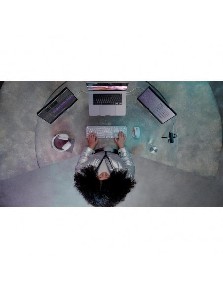 O teclado Logitech MX Keys S oferece uma experiência de escrita confortável e eficiente. Com conectividade sem fios dupla (RF Wireless + Bluetooth), permite emparelhamento com múltiplos dispositivos. O design elegante em alumínio branco, com retroiluminação ajustável, proporciona uma experiência premium.