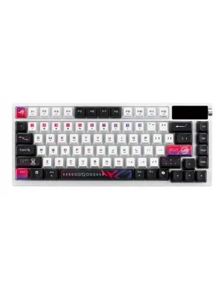Teclado mecânico para jogos ASUS ROG Azoth X, com design personalizado de 75%, interruptores ROG NX V2 hot-swappable, teclas sublimadas e semitranslúcidas, placa superior em metal, e sistema de amortecimento de cinco camadas para uma experiência de digitação suave e precisa. Conectividade tri-modo (USB, RF 2.4GHz, Bluetooth), ecrã OLED, botão de controlo rotativo, descanso de pulso e compatibilidade com Mac.