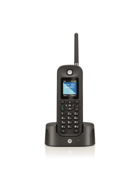 O telefone sem fios Motorola O201 destaca-se pelo seu longo alcance (até 1km ao ar livre), robustez e resistência à água (IP67).  Oferece um ecrã a cores de 1,8?, mãos-livres e capacidade para 200 contactos.  Ideal para quem procura um telefone fiável e duradouro.