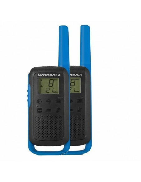 Walkie-talkies Motorola T62 (EAN: 5031753007300), modelo PMR com 16 canais e subcanais CTCSS (121).  Oferece 18 horas de autonomia com bateria própria.  Inclui carregador e baterias recarregáveis. Preto e azul. Peso: 161g.