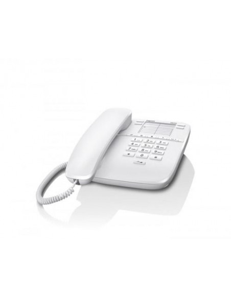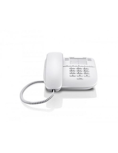 Telefone fixo analógico Gigaset DA310, na cor branca. Um modelo simples e funcional, ideal para uso doméstico ou em escritórios com necessidades básicas de comunicação. Fácil de instalar e usar, com algumas funções essenciais para chamadas telefónicas.